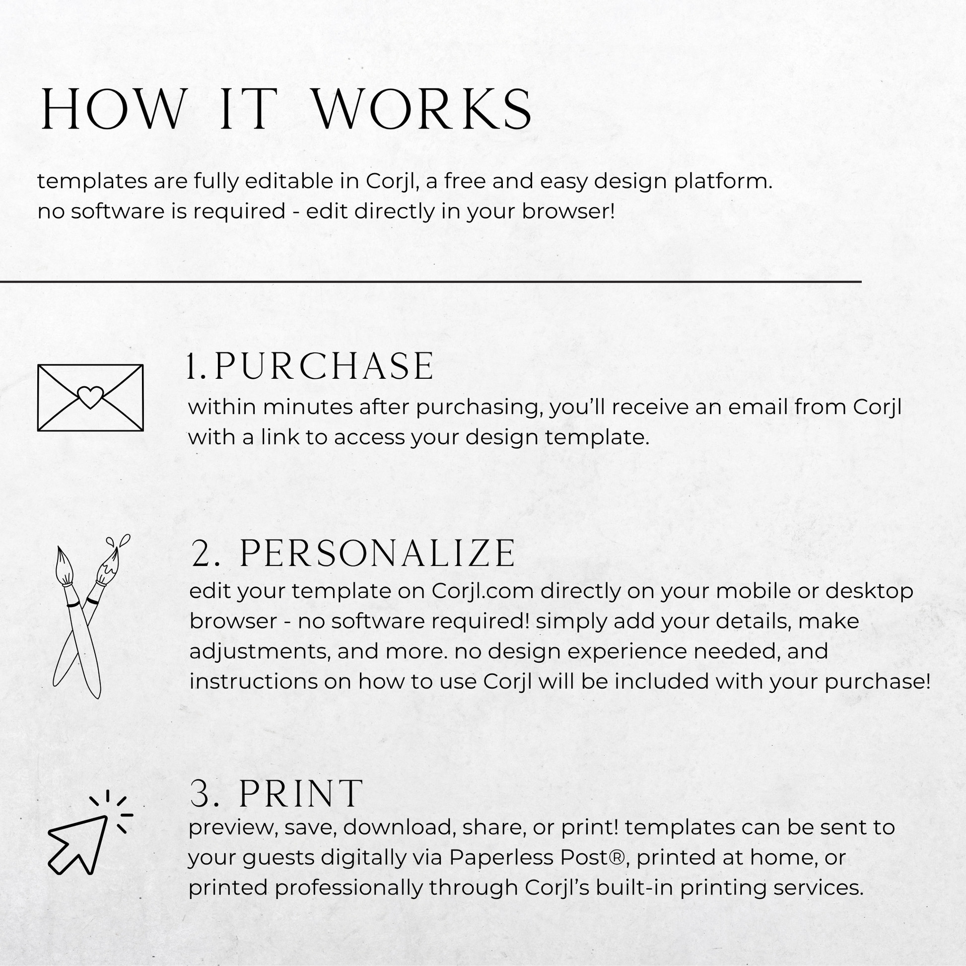 Fully editable in Corjl, this digital template lets you customize every detail for your event — then send it digitally via Paperless Post or print beautifully either at home or through Corjl Prints. Corjl is a free online editing platform (no additional purchases, pro upgrades, nor software downloads required) - simply edit on your desktop computer, mobile device, or tablet in minutes.