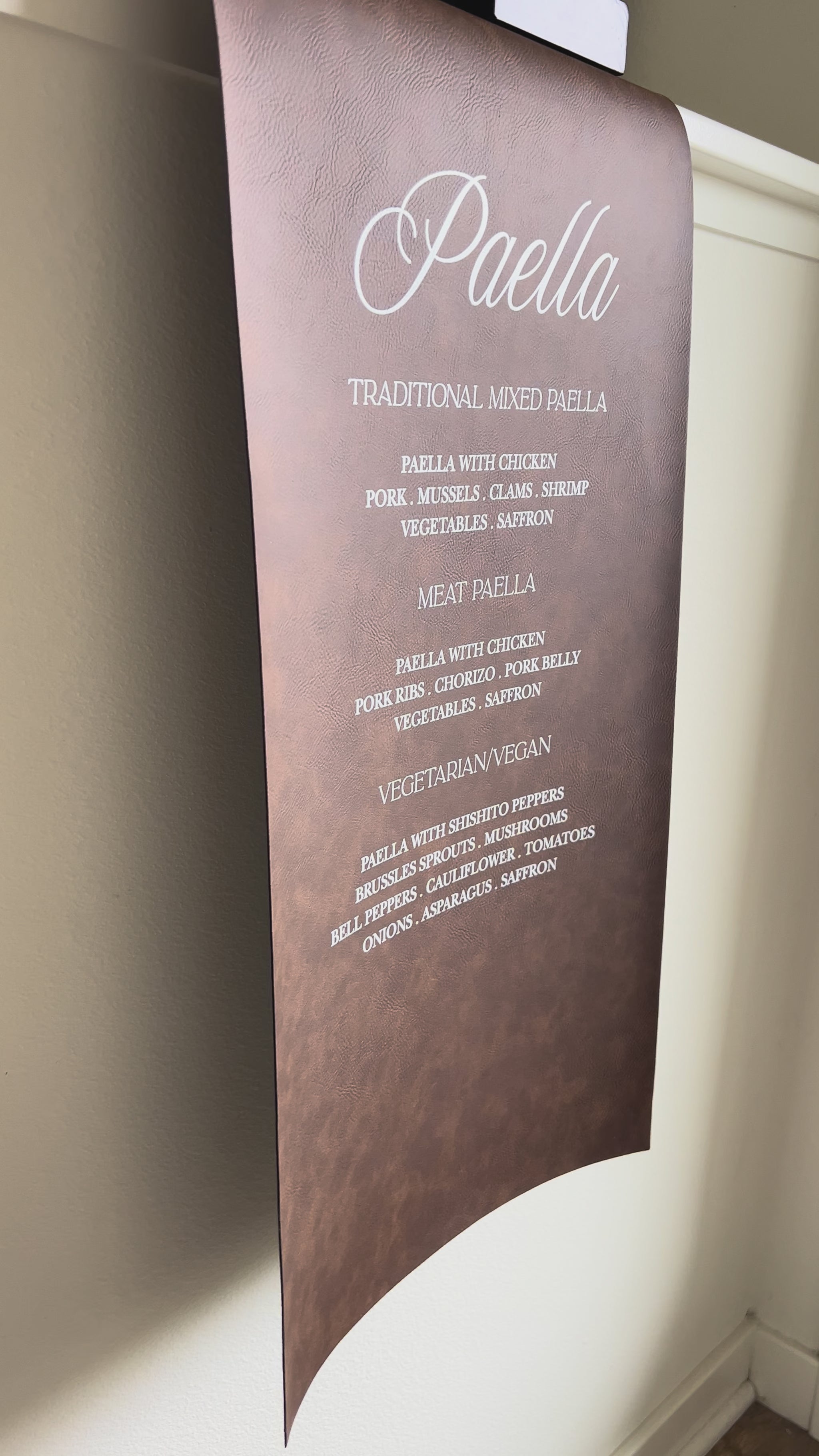 High-quality PU leather draped bar and menu sign, handcrafted to create an elevated impression for your cocktail bar or reception menu. Leather is available in three beautiful colors: Cocoa, Licorice, and Biscotti. Lettering is printed directly onto the leather, available in black, white, or brown production-quality UV ink; if you would like a custom color ink, please let us know in the 'personalization box' and we will do our best to accommodate. Eight design styles are available for your font selection (see product image slides for options). A digital design mockup will be sent to you for approval before production.