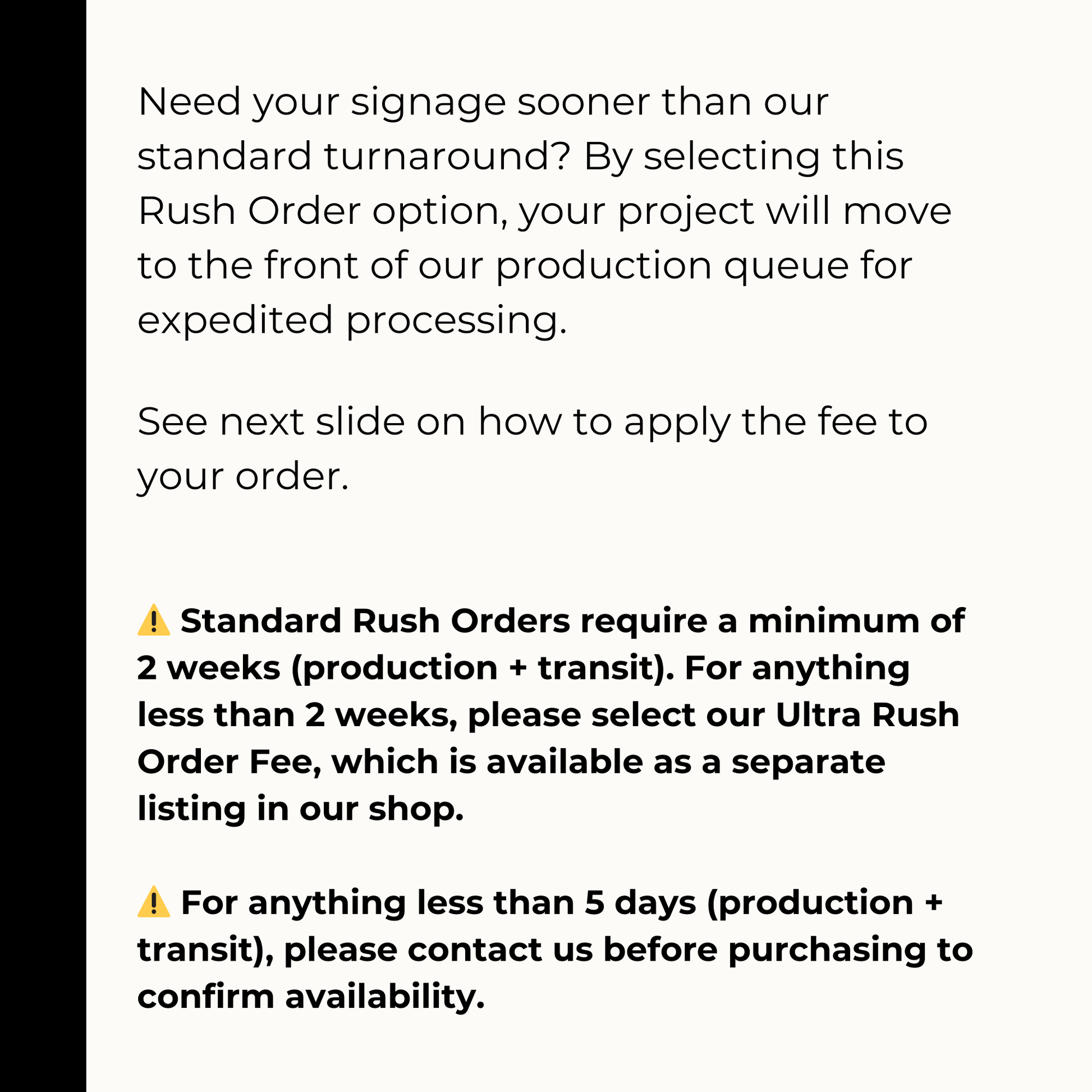 Need your signage sooner than our standard turnaround? By selecting this Rush Order option, your project will move to the front of our production queue for expedited processing and will be shipped with expedited UPS service. To apply, simply add this listing to your cart along with your signage order. Please include your event date and requested delivery deadline in the order notes so we can confirm your timeline.