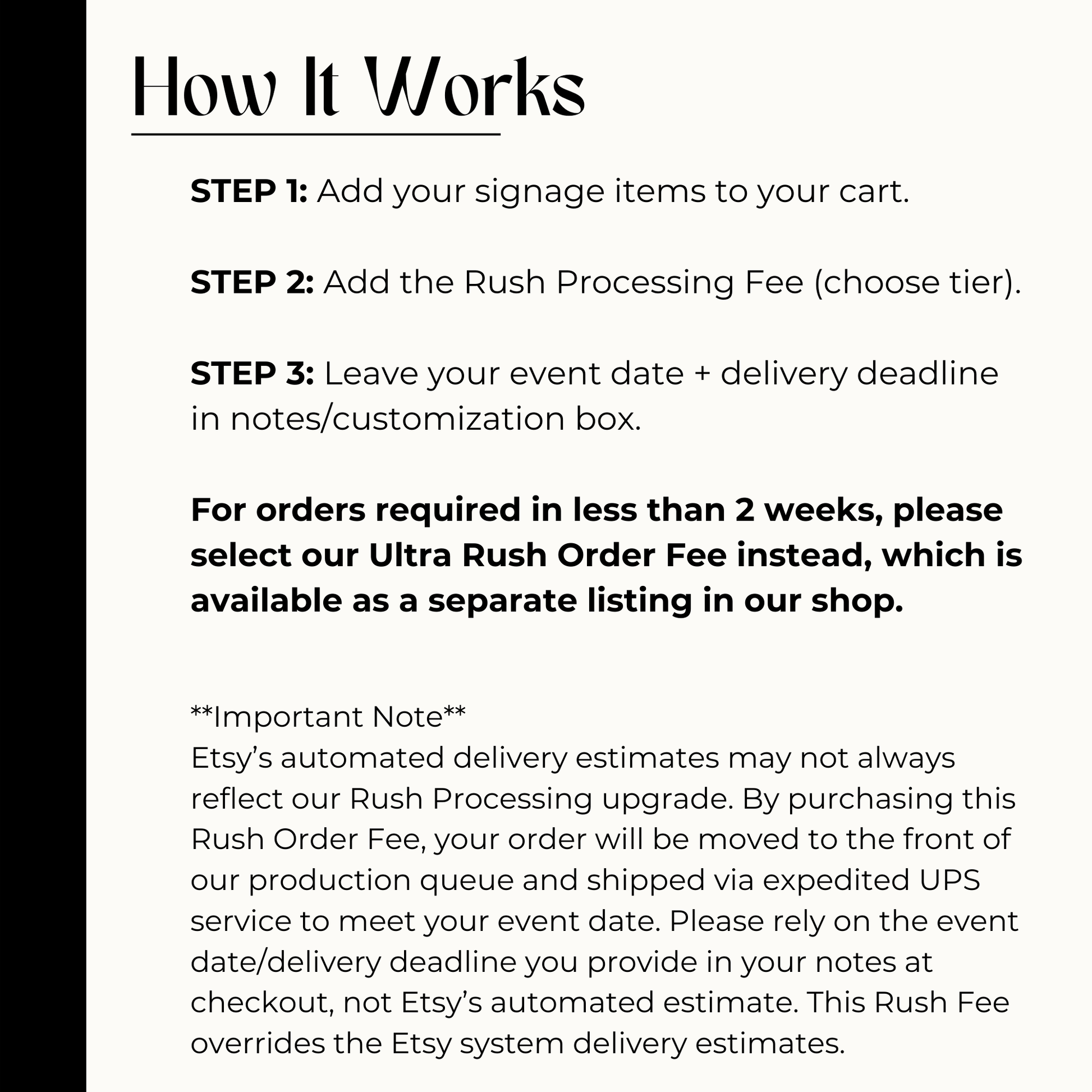 Important Note: The automated delivery estimates at checkout may not always reflect our Rush Processing upgrade. By purchasing this Rush Order Fee, your order will be moved to the front of our production queue and shipped via expedited UPS service to meet your event date. Please rely on the event date/delivery deadline you provide in your notes at checkout, not the automated estimate at checkout. This Rush Fee overrides the checkout system delivery estimates.